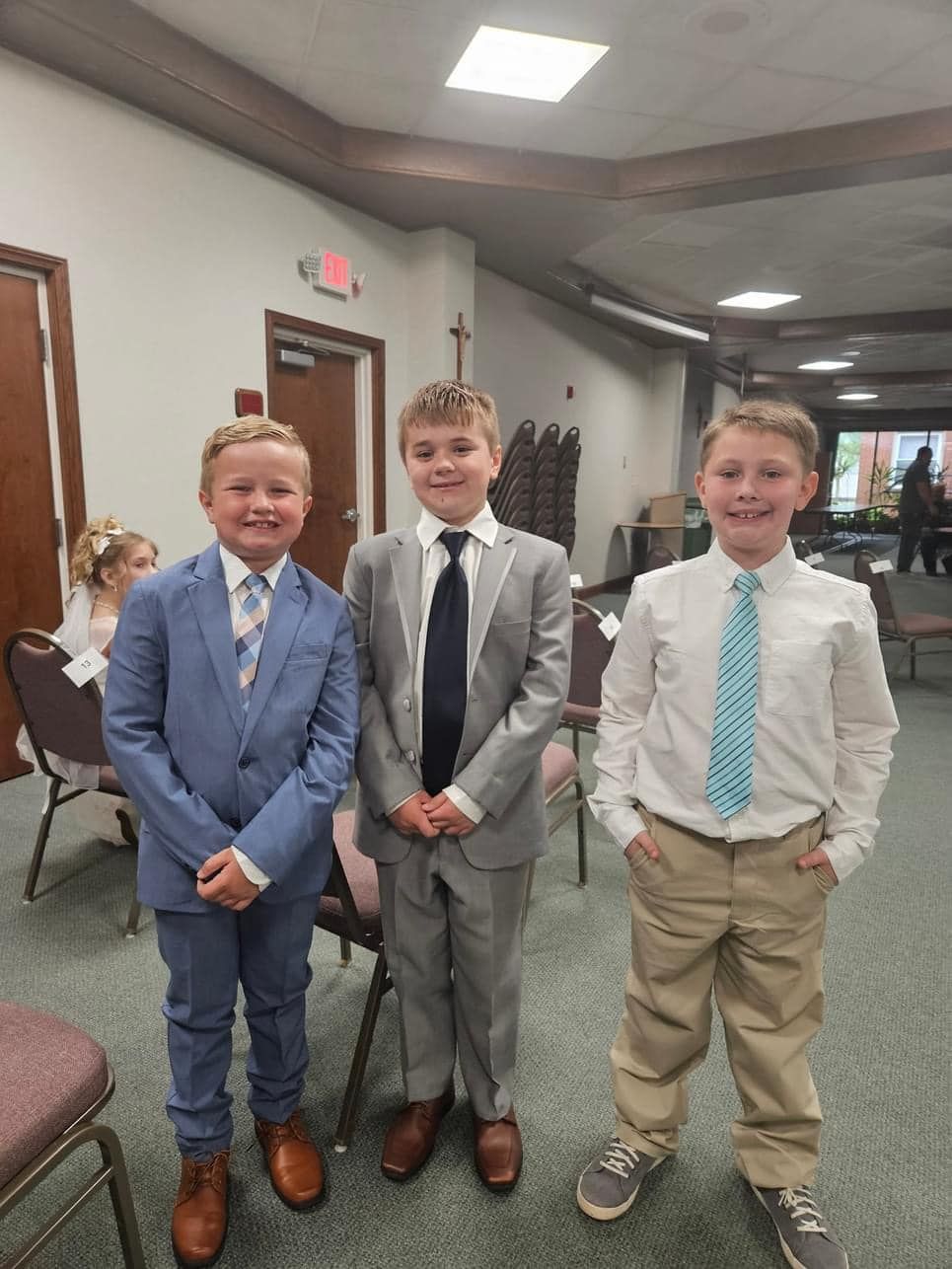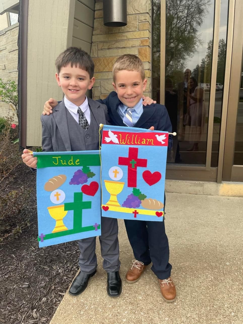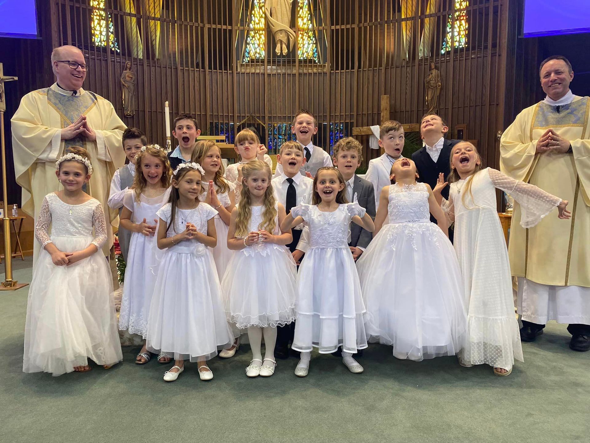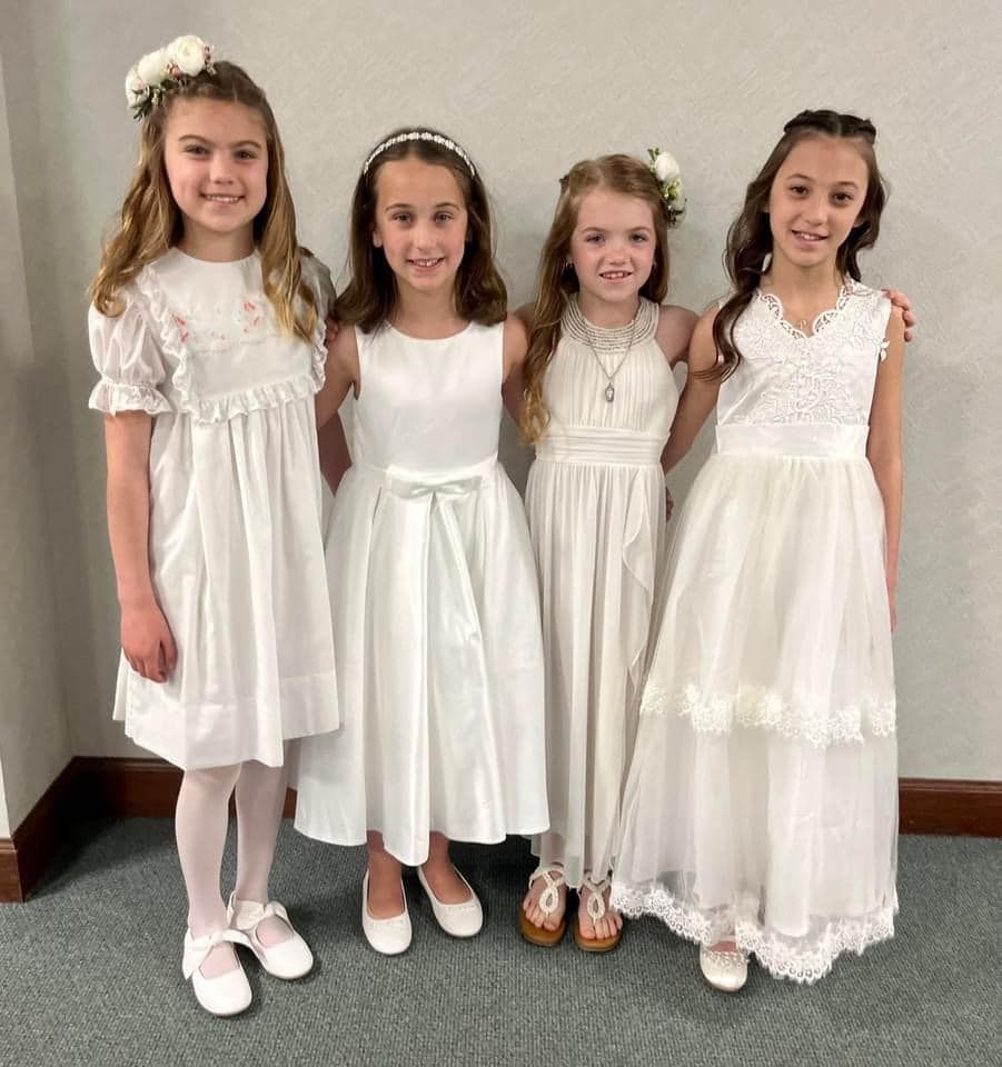 Generally first Eucharist is received by children when they are in second grade at the age of seven. Children must be enrolled in our Catholic school or PSR program in order to receive First Eucharist or Communion. Children must complete first grade PSR before they will be permitted to enroll in our second grade PSR class. This year First Communion for second grade students is Sunday May 3, 2026 at 10:30 AM. Adults wishing to receive first Eucharist must take adult preparation classes beforehand.
