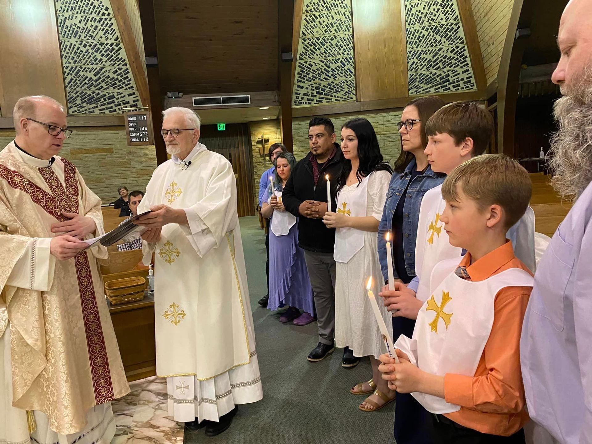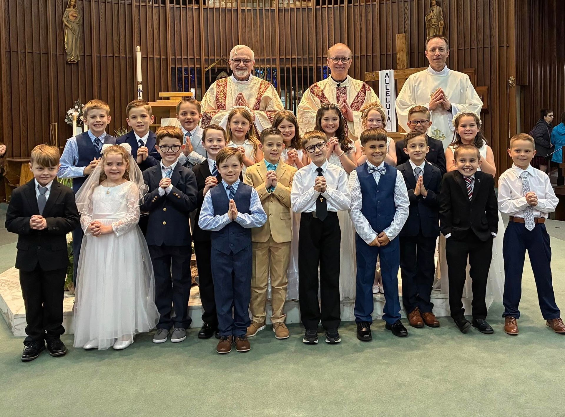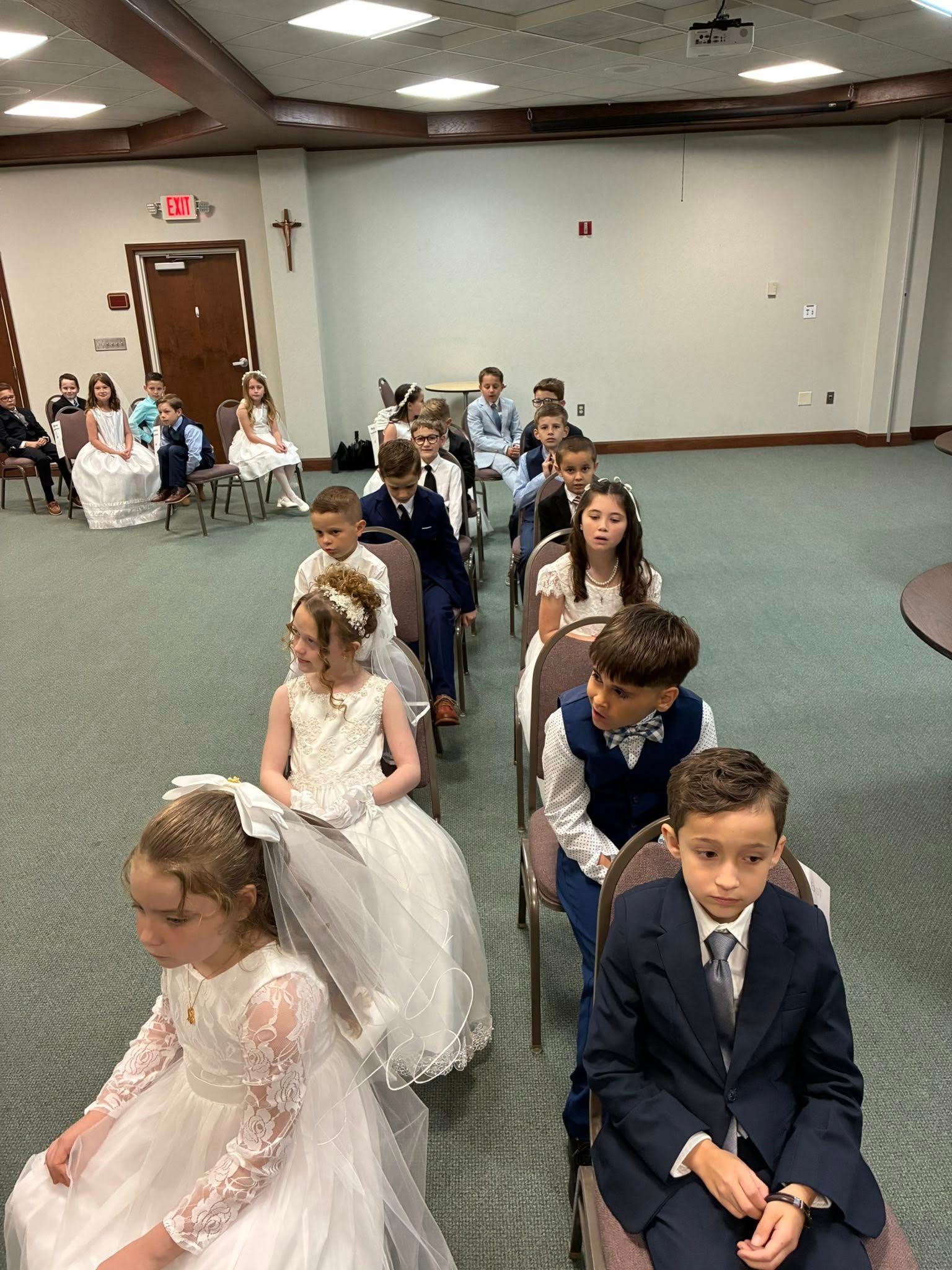 Generally first Eucharist is received by children when they are in second grade at the age of seven. Children must be enrolled in our Catholic school or PSR program in order to receive First Eucharist or Communion. Children must complete first grade PSR before they will be permitted to enroll in our second grade PSR class. Adults wishing to receive first Eucharist must take adult preparation classes beforehand.