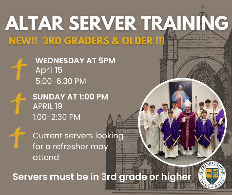 A variety of opportunities for assisting with the liturgy are available at St. Peter’s. Everyone is welcome, and we would love to see you choose to get involved!